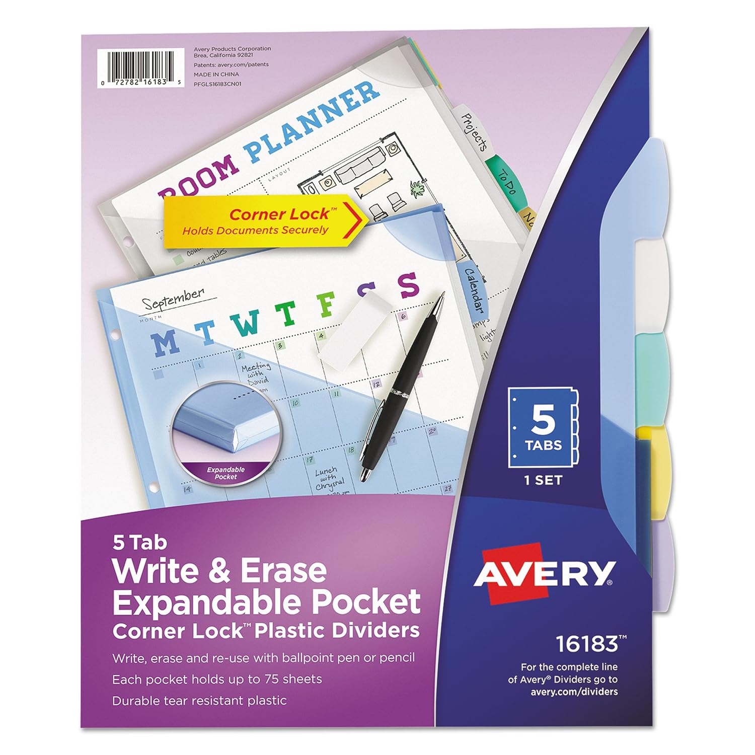 Avery 16183 Write Erase Big Tab Plastic Dividers 5 Tab W Corner Lock Exp Pocket Letter
