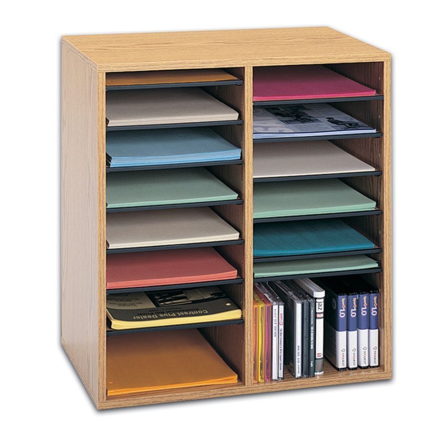 Safco Adjustable Wood Literature Organizer 20 H X 19 1 2 W X 11 3 4 D 16 Compartments Oak Item 402411